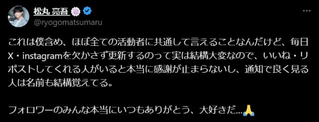 「これは僕含め、ほぼ全ての活動者に共通して言えることなんだけど、毎日X・instagramを欠かさず更新するのって実は結構大変なので、いいね・リポストしてくれる人がいると本当に感謝が止まらないし、通知で良く見る人は名前も結構覚えてる。」と毎日の更新への大変さをアピールしつつ、投稿に反応を示すフォロワーたちへの感謝を綴った。