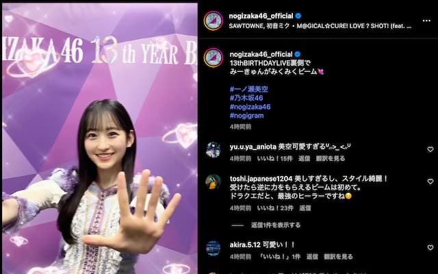 「13th BIRTHDAY LIVE裏側でみーきゅんがみくみくビーム」と綴り、グループ結成13周年ライブの裏側で、メンバー・一ノ瀬美空が自身の名前にちなみ「M@GICAL☆CURE! LOVE ? SHOT! (feat. Hatsune Miku)」の「みくみくビーム」を披露する様子を撮影した動画をアップした。