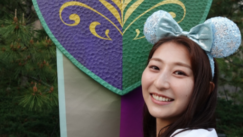 ミニーカチューシャを付け、夢の国を満喫する笑顔の塩越にファンの注目が集まっている。