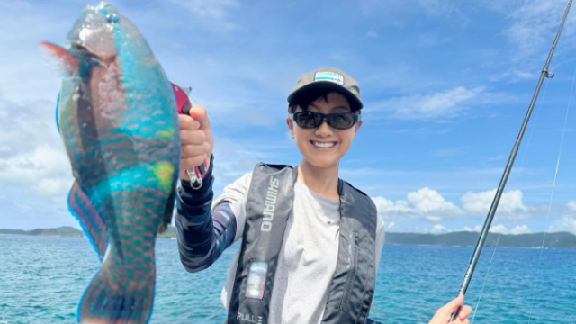 「慶留間島での釣果③オビブダイ(イラブチャー)自然界にこんな美しい生き物がいるんだって考えただけで何か嬉しくなる。」と綴り、自身が写った写真1枚をアップ。