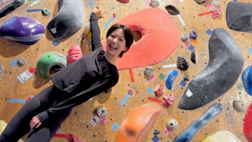 ボルダリングの壁をバックに楽しそうな笑顔の海老原にファンの注目が集まっている。