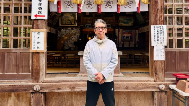 「ホテ散歩@福岡〜糸島。玄界灘に突き出す糸島半島、深い杜に抱かれた櫻井神社へ。雨上がりの澄んだ空気を胸いっぱいに吸い込み、この旅の無事を祈る。御神木に手を置けば、静かに、そして力強く、深いエネルギーが伝わってくる。」と綴り、自身が写った写真数枚をアップ。
