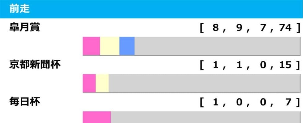 ・皐月賞【8.9.7.74】 ・京都新聞杯【1.1.0.15】 ・毎日杯【1.0.0.7】 ・青葉賞【0.0.2.19】 ・プリンシパルS【0.0.1.8】