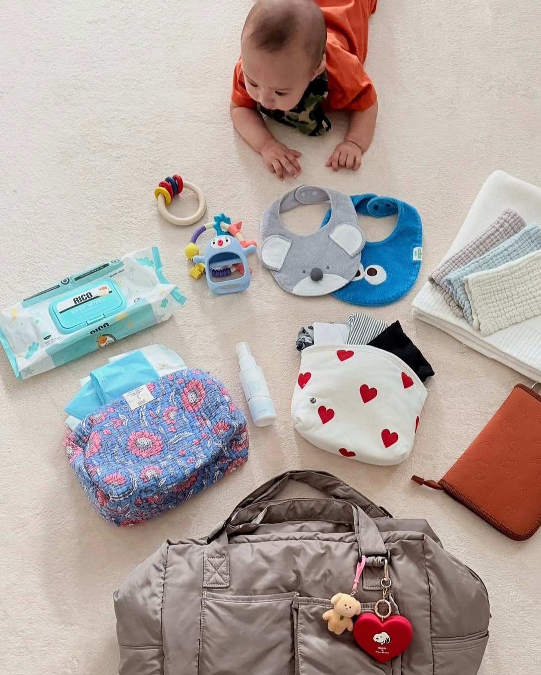 "お出かけの日の持ち物たち"をアップ。マザーズバックの中身をすべて出し、ひとつひとつ紹介している写真などを公開。綺麗に並べられた持ち物たちをはいはいポーズで見つめる息子が、なんとも可愛すぎて見ているこちらまでほっこり癒しを誘われる投稿となっている。