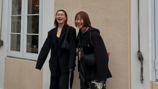 黒いジャケットと、白いストライプの入った黒のパンツを着用している村上。以心伝心でコーディネートが被ったのだろうか。友人とふたりで、心から楽しそうな笑顔を見せている。