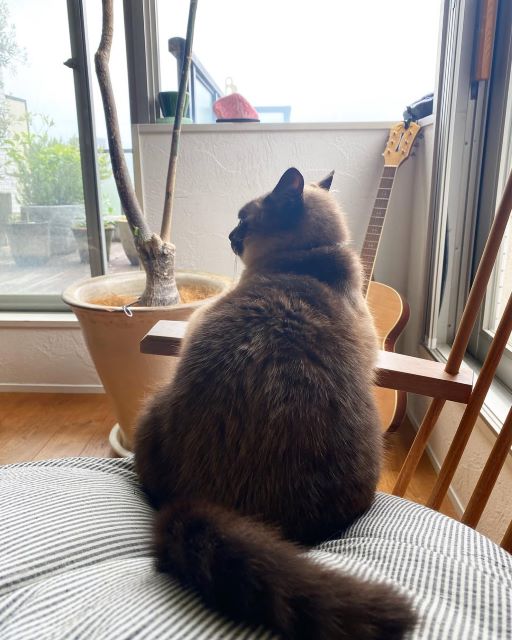 青木さやかの暮らしに溶け込む背中。光とギターと観葉植物の中で、静けさをまとう猫が座っていた風景 | 話題の投稿