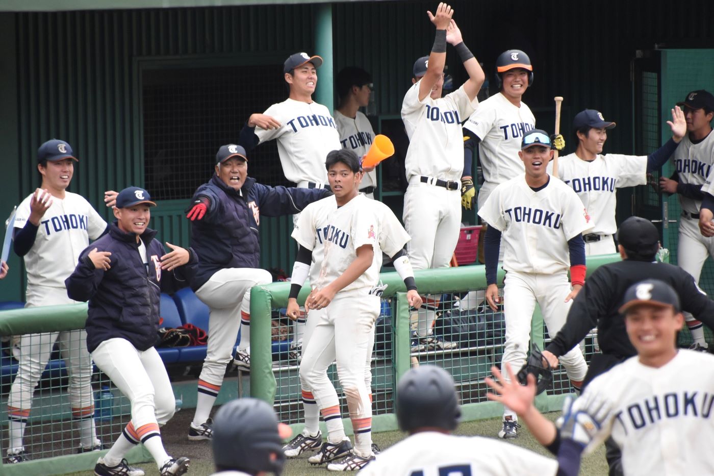 今年の東北福祉大は一味違う。そう思わせる一戦があった。4月26日の東北学院大1回戦。初回に先制を許すとその後は点の取り合いとなり、7回までビハインドの状態が続いた。3対4で迎えた8回に追いつき、9回に1点を勝ち越して勝利。苦しみながらも手にした貴重な1勝だった。