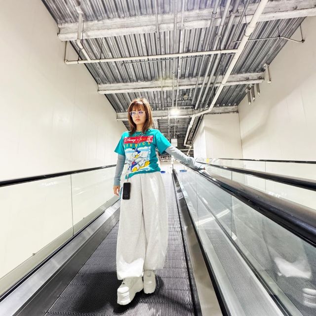 無機質な通路にポップなTシャツが映えて、まるでファッション誌の1ページのようだ。ヴィンテージ感あふれるドナルドのプリントと、ゆるっとした白パンツのバランスが絶妙で、古着コレクションを心から楽しんでいるのが伝わってくる。歩く歩道の上で凛と立つ姿も印象的で、日常に自分らしいスタイルをしっかりと刻んでいる。