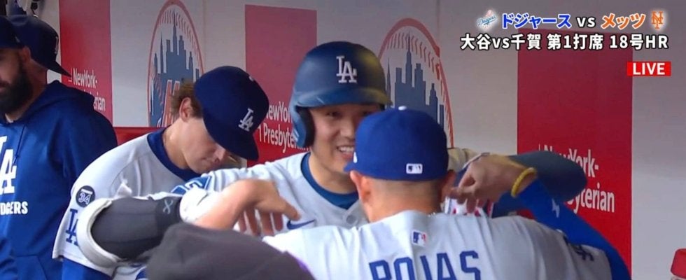 初回、大谷はメッツ先発の千賀滉大投手から今季4本目、メジャー通算16本目となる18号先頭打者アーチを叩き込み、チームに勢いをもたらした。ベンチはお祭り騒ぎのような祝福ムード。満面の笑みを浮かべる大谷の姿に、視聴者のテンションも最高潮に達した。