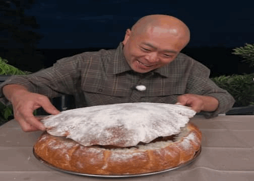 巨大なパンをお皿に見立て、中にビーフシチューが入った写真を披露。