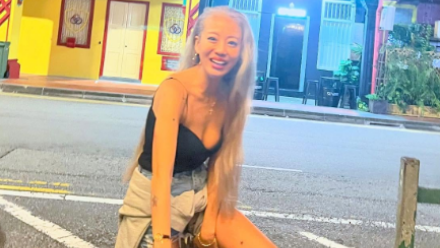 1枚目2枚目の写真はカラフルな建物をバックに楽しそうな表情だが、3枚目の写真は「見てよこれ!」と言わんばかりに溝にハマったとされる足元を指さすあびるの姿が写っている。