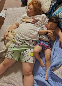 息子と愛犬と一緒に寝ている姿の写真を公開した。