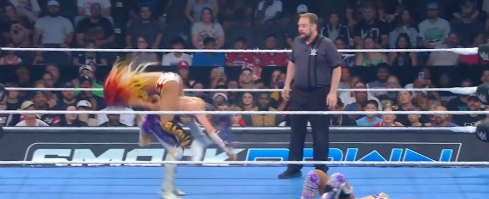 世界的人気を誇る女子レスラーが衝撃技の被害に遭った。前屈みの状態から背後に“半回転”。後頭部をリングに打ち付けてファンが頭を抱えた。