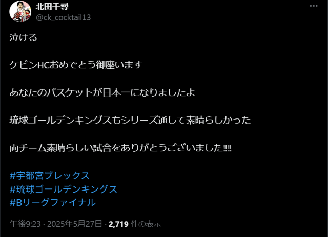 「泣ける。ケビンHCおめでとう御座います。あなたのバスケットが日本一になりましたよ」と祝福メッセージを綴り、Bリーグ決勝の宇都宮ブレックス対琉球ゴールデンキングスへの思いを語った。