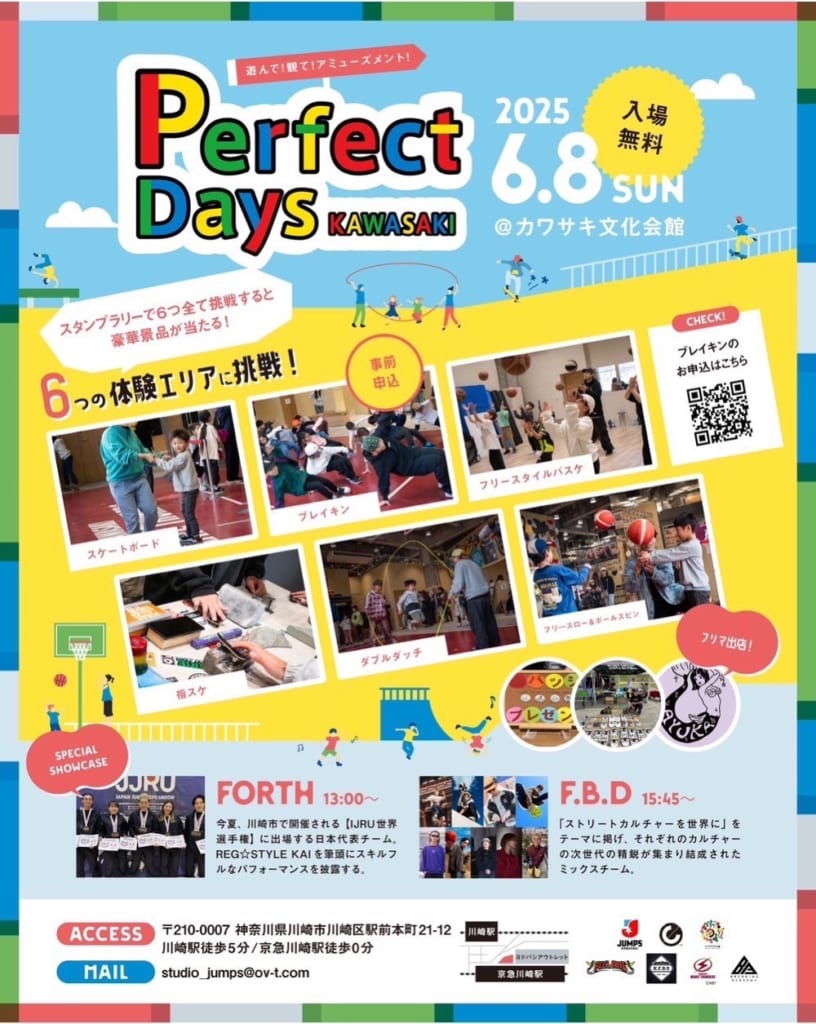 2025年6月8日(日)アーバンスポーツ体験イベント「Perfect Days KAWASAKI」がカワサキ文化会館で開催される。同イベントは今回で6回目の開催!「ダブルダッチ」、「スケートボード」、「フリースタイルバスケットボール」、「ブレイキン」、「指スケ」の体験ブースを展開!
