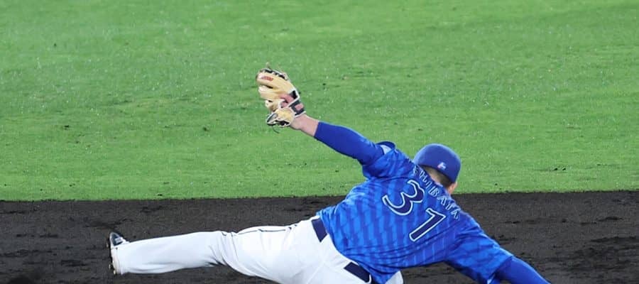 柴田は「8番・遊撃」で先発出場。0-0の4回、先頭の4番・佐藤輝がアンソニー・ケイ投手から三遊間に痛烈な打球を飛ばした。安打性の当たりだったが、柴田はさっと追い付くと、変わったバウンドにもしっかり合わせて体勢を崩しながらも見事に捕球。すぐさま一塁に送球して打者走者をアウトにした。