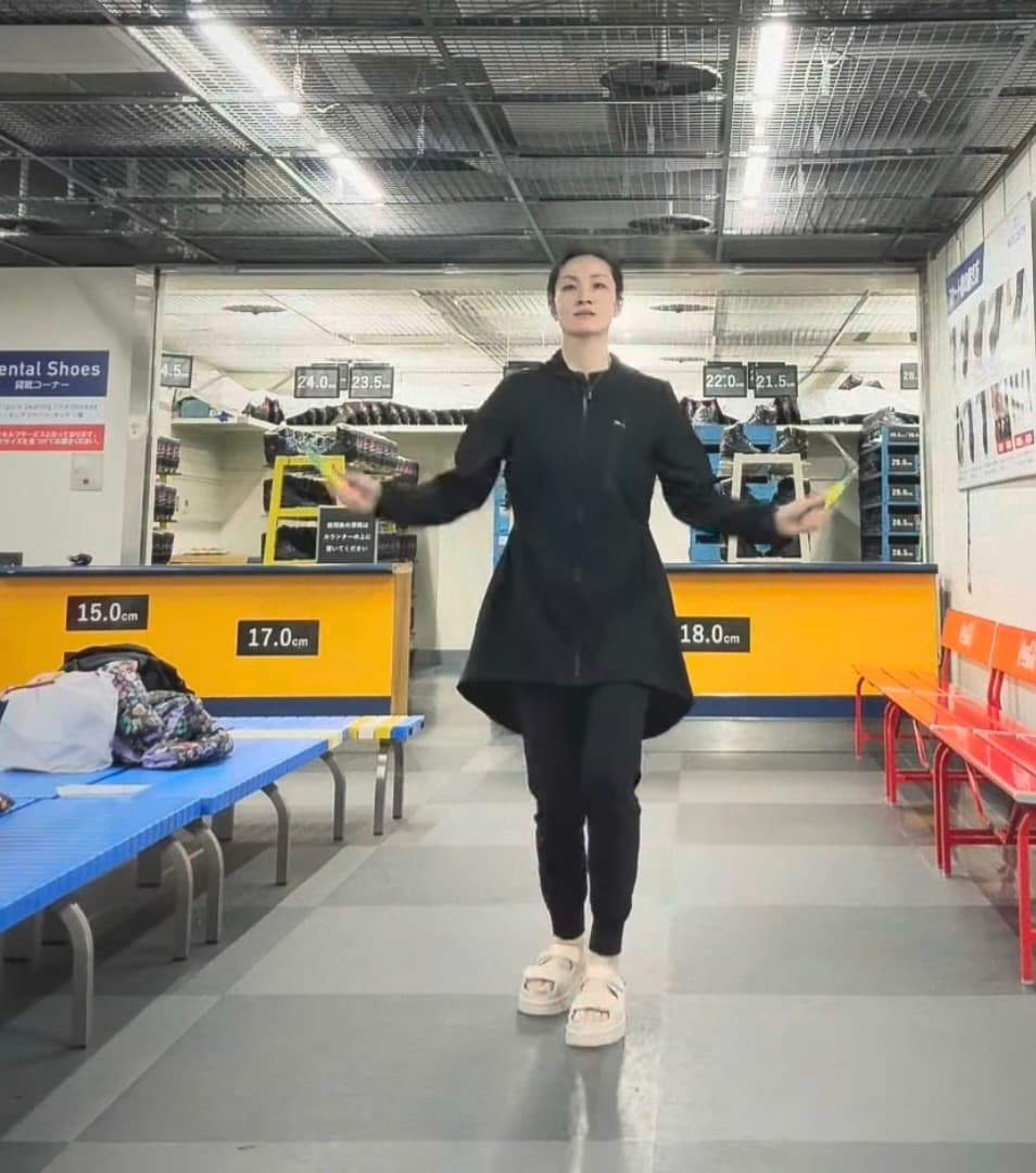 全身黒のスタイリッシュなスタイルで縄跳びを持ち登場!厚底サンダルを履いているにも関わらず、二重跳びや交差跳びなどを交え華麗に披露する荒川。軽々しく披露する荒川の動画に称賛の声が続々と寄せられ注目を集めている。