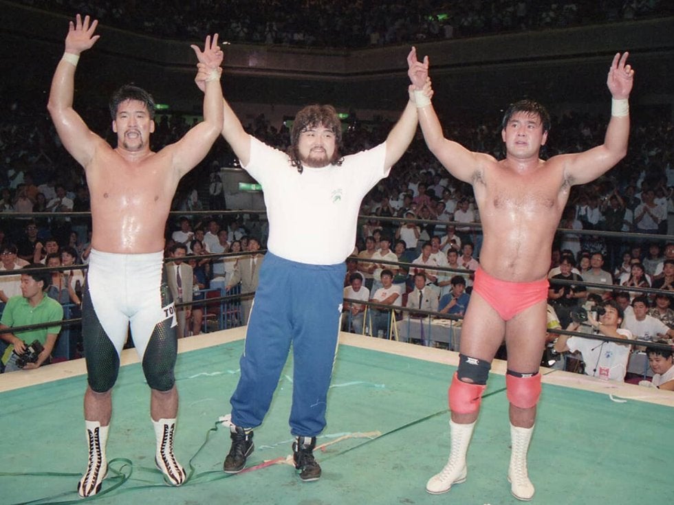 第1回G1の優勝定戦後の闘魂三銃士。(左から)蝶野正洋、橋本真也、武藤敬司