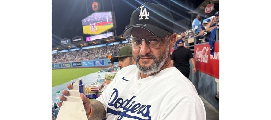 カメラ席の真横で観戦していたドジャースファンのマシュー・アーチャーさんは、大きな破片をゲット。「ワーオ! という感じでした。ガラスが割れたのかと思いましたよ!」。フェンスの破片はマシューさんだけでなく、周りの観客もゲット。「これが破片だよ!」と嬉しそうだった。(上野明洸 / Akihiro Ueno)