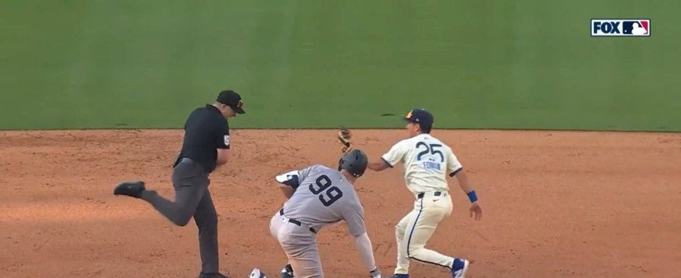キムは巧みなクッション処理からセカンドへノーバウンド送球。セカンドベースカバーに入ったエドマンが、スライディングしてきたジャッジの足に見事なタッチ。チャレンジすら許さない完璧なプレーで、ジャッジの孤軍奮闘を断ち切った。