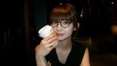 黒のノースリーブワンピースにメガネ姿で、ドリンクを持つ荻野。4月に第一子の妊娠を報告しているため、ファンからは体調を気遣う声が寄せられている。