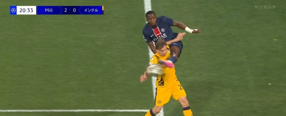 自陣深い位置、ライン上でウィリアム・パチョがアクロバティックな体勢でクリア。まさに“1mm”級のギリギリのところでボールを残してパリSGのボールになると、クビチャ・クワラツヘリアの持ち運びからカウンターがスタートした。