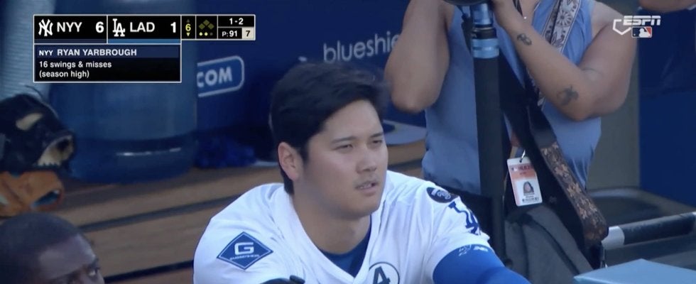 1-6とドジャースが5点を追いかけていた6回、先頭打者として打席を迎えた大谷は、サードゴロに倒れていた。2死走者なし、フリーマンの打席中、現地中継カメラはベンチで試合を見つめる大谷の姿に切り替わる。