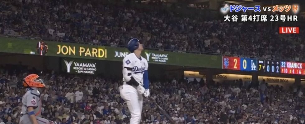 誰もが確信する一発だった。ドジャースの大谷翔平投手が「1番・DH」でスタメン出場し、7回の第4打席で23号ソロホームランを記録。打った直後のリアクションが注目を集めている。
