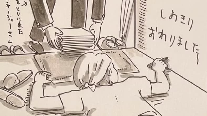 「しめきり、 おわりました‥。☺️✨玄関で力尽きました 」と綴り、1枚のイラストをアップした。