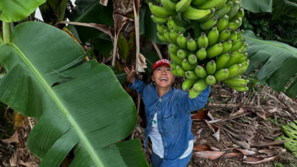 「バナナ成長記録〜OKINAWA〜寒い山の家から、移動して沖縄の家へ。育ててるバナナも、梅雨入りして雨と太陽のエネルギーをガッツリもらい、どんどん成長。なんか写真が私小さくなったみたいに見える。」と綴り、自身が写った写真数枚をアップ。