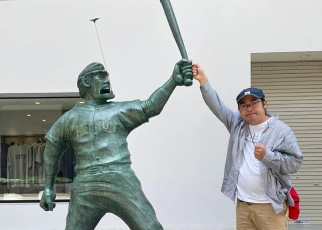 新潟市中央区古町通5番町の商店街にある、野球漫画『ドカベン』に登場するキャラクター岩鬼正美の銅像と、中岡氏が拳同士をタッチさせるツーショットである。野球が大好きで楽しくて、銅像に会えて嬉しそうな中岡氏の様子が伝わってくる。
