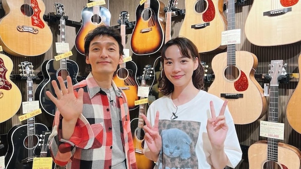 写真には、たくさんのギターをバックに、のんと草彅剛が写っている。二人は楽器屋でギターの試奏を楽しんだようだ。