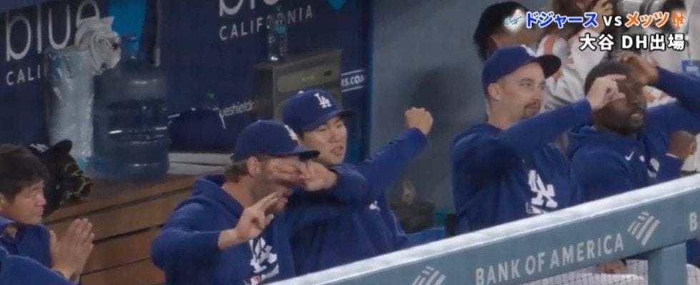 0-3、ドジャース3点のビハインドを追う3回裏・ドジャースの攻撃、2死走者なしの場面で打席に立った1番・大谷は、メッツ先発のグリフィン・キャニングに対し、その初球、内角高めのへと投じられたボール気味、151km/hの速球を豪快に振り抜くと、低い弾道で一二塁間を飛び越え、そのまま高速でライト前へと落ちるシングルヒットに。その際、現地の中継カメラは、大谷のヒットを喜ぶドジャースベンチの模様を映し出すこととなったが、その際に映ったカーショウは、到達した一塁塁上で安堵の笑顔を見せる大谷に向って“デコルテポーズらしき何か”を見せてはいたものの、そのパフォーマンスは両手の手でVサインをし、左右交互に額の前を通過させるという、本家とは微妙に異なるバージョンのもの。そのため、この姿を観たファンからは「カーショウさんw」「やりすぎw」「隣のキムは間違いに気づいてるw」「カーショウさんには言えないw」「雰囲気ええなw」といった様々な反響が巻き起こることに。