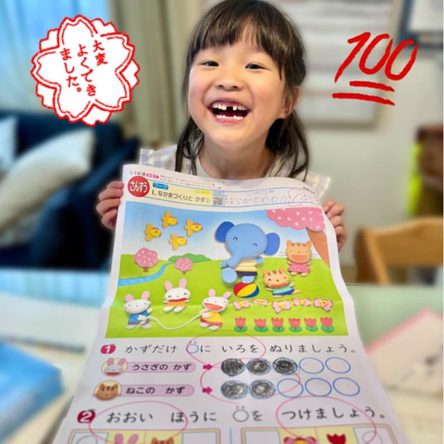 ののちゃん、初めてのテストで100点を取り「さすがのんちゃん!よく出来ました」