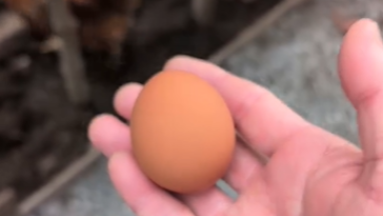 鶏三姉妹をバックに、産みたて卵を手に乗せ感謝の言葉をかける照英にファンの注目が集まっている。