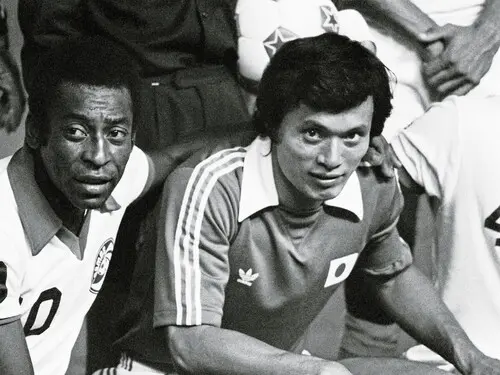 ペレと一緒に写真に納まる釜本邦茂