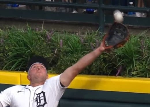 デトロイト・タイガースのケリー・カーペンターが素晴らしいジャンピングキャッチを決め、チームのリードを死守した。