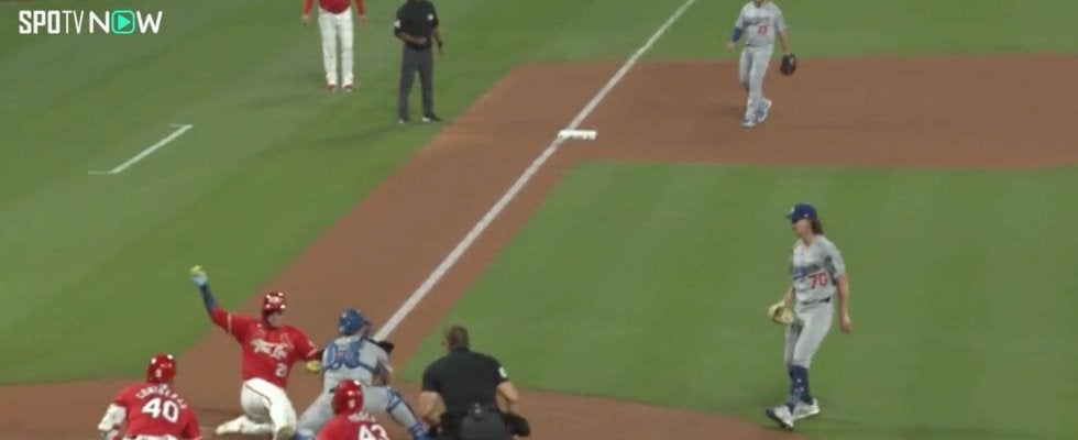 ここで二塁ランナーのヌートバーは一気に三塁ベースも蹴ってホームに突入。ドジャースのセンターを守るパヘスから好返球が帰ってきたことで、ホームベース上でギリギリのプレーとなったが、最後はヌートバーの右足が先に滑り込みセーフの判定となった。