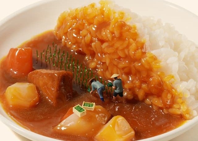 ごろっとした人参や牛肉を岩、カレールーを田んぼ、ご飯を米俵に見立てて田植えの光景を見事に表現している。