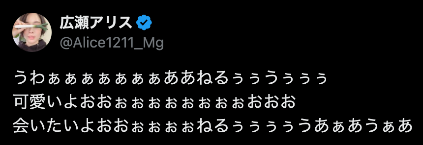 女優、タレントとして大人気の広瀬アリスが8日、自身のX(@Alice1211_Mg)を更新し、愛を叫んだ。