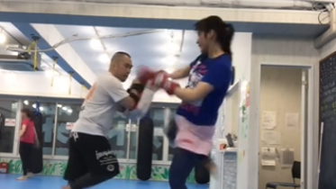 見事な足さばきでキックボクシングのトレーニングを行う上原の姿にファンの注目が集まっている。