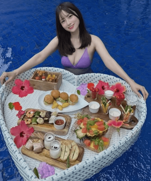なお、プールにトレイを浮かべた、優雅な朝食スタイルをフローティングブレックファーストと呼ぶ。