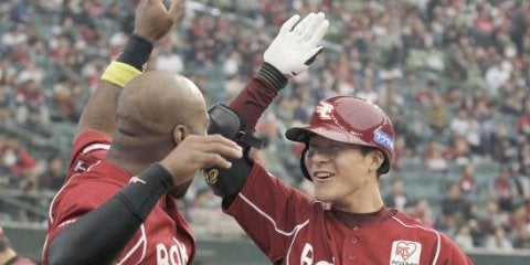 1回、先頭打者本塁打を放ち、ウィーラー(左)に迎えられる楽天・茂木=メットライフドーム【写真提供:共同通信社】レギュラー…