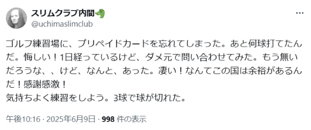 スリムクラブ内間、ゴルフのプリペイドカードを紛失も「感謝感激!」と翌日に見つかるも… | 話題の投稿