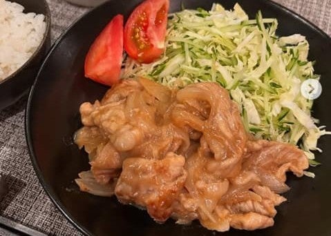 「にんにくも足してスタミナ満点生姜焼き定食の完成。」と綴り、2枚の写真をアップ。