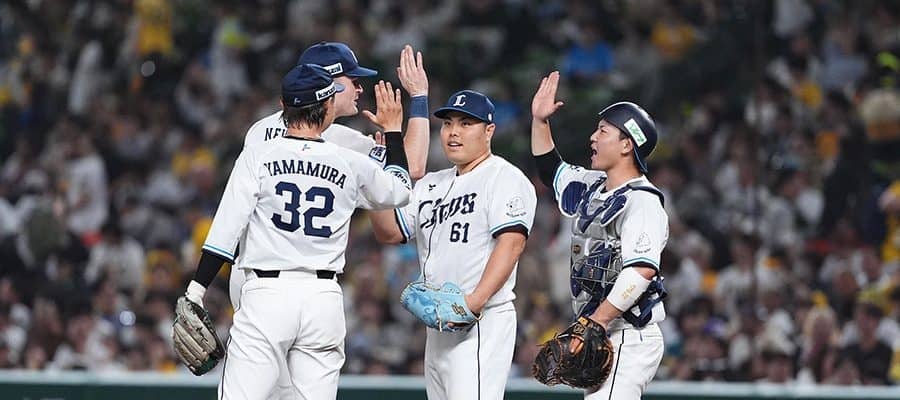 一方の打線は、相手投手陣を攻めあぐねる苦しい展開に。しかし8回裏、西川愛也外野手、滝澤夏央内野手の連続安打などで好機を演出。ここでタイラー・ネビン内野手が適時二塁打を放ち1点差に詰め寄ると、なおも1死満塁から源田壮亮内野手の適時打で同点に追い付く。さらに山村崇嘉内野手の適時打、長谷川信哉外野手の犠飛で2点を勝ち越した。