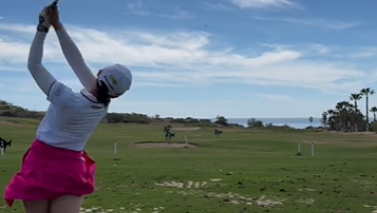 マン振り(自分の限界を超えるくらい全力でクラブを振ることを意味する俗語)で最後少しだけヨロっと体勢を崩すものの、豪快スイングにファンの視線も釘付けのようだ。