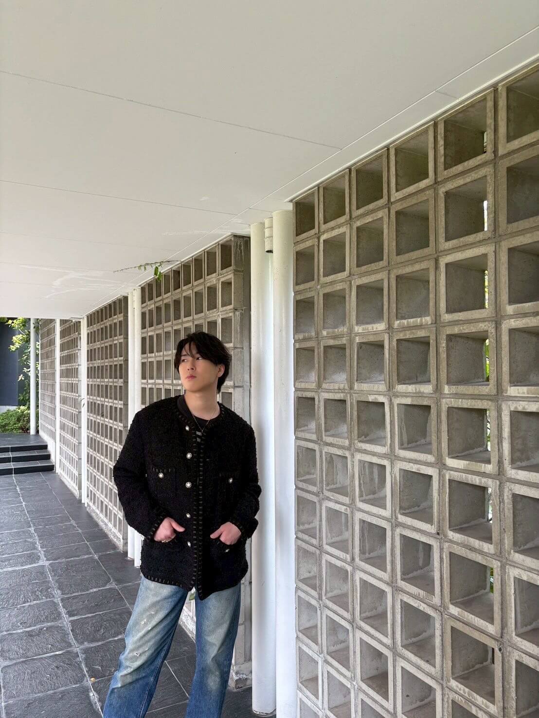 黒のジャケットにデニムを合わせた私服を披露した。