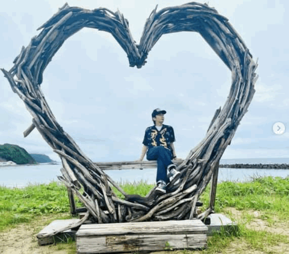福岡県糸島市でのショットを投稿した。写真には、ベンチに座る姿や土管の上に立つ姿などを披露。