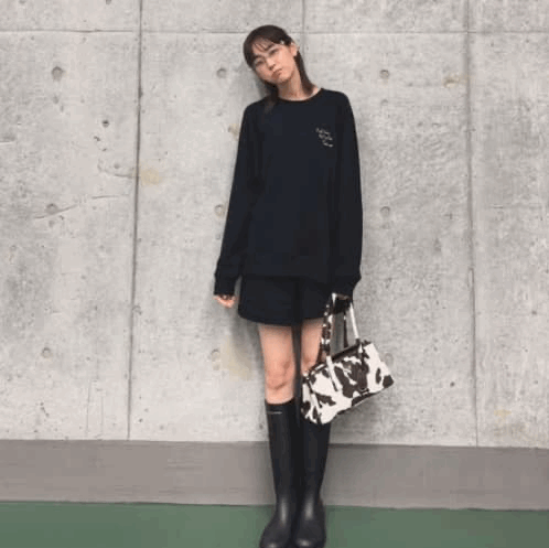 梅雨シーズンのコーデを投稿。上下黒のコーデに長靴を着用した姿を披露した。
